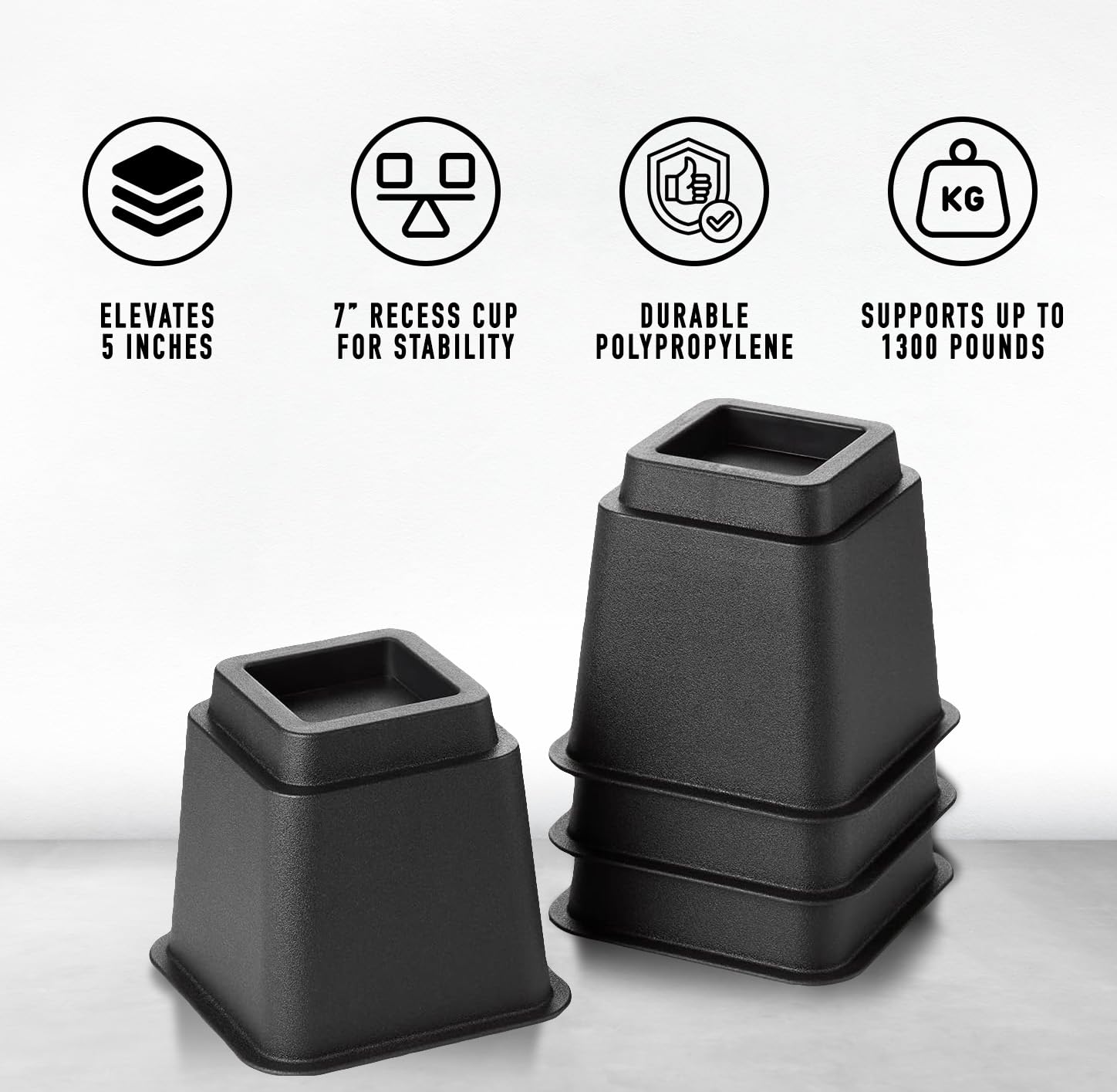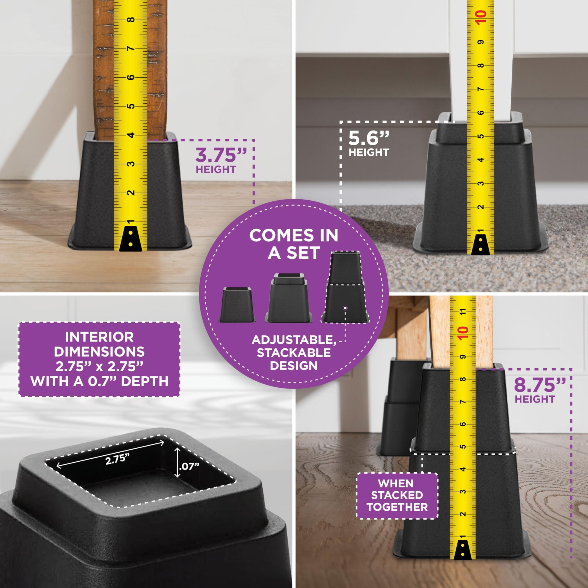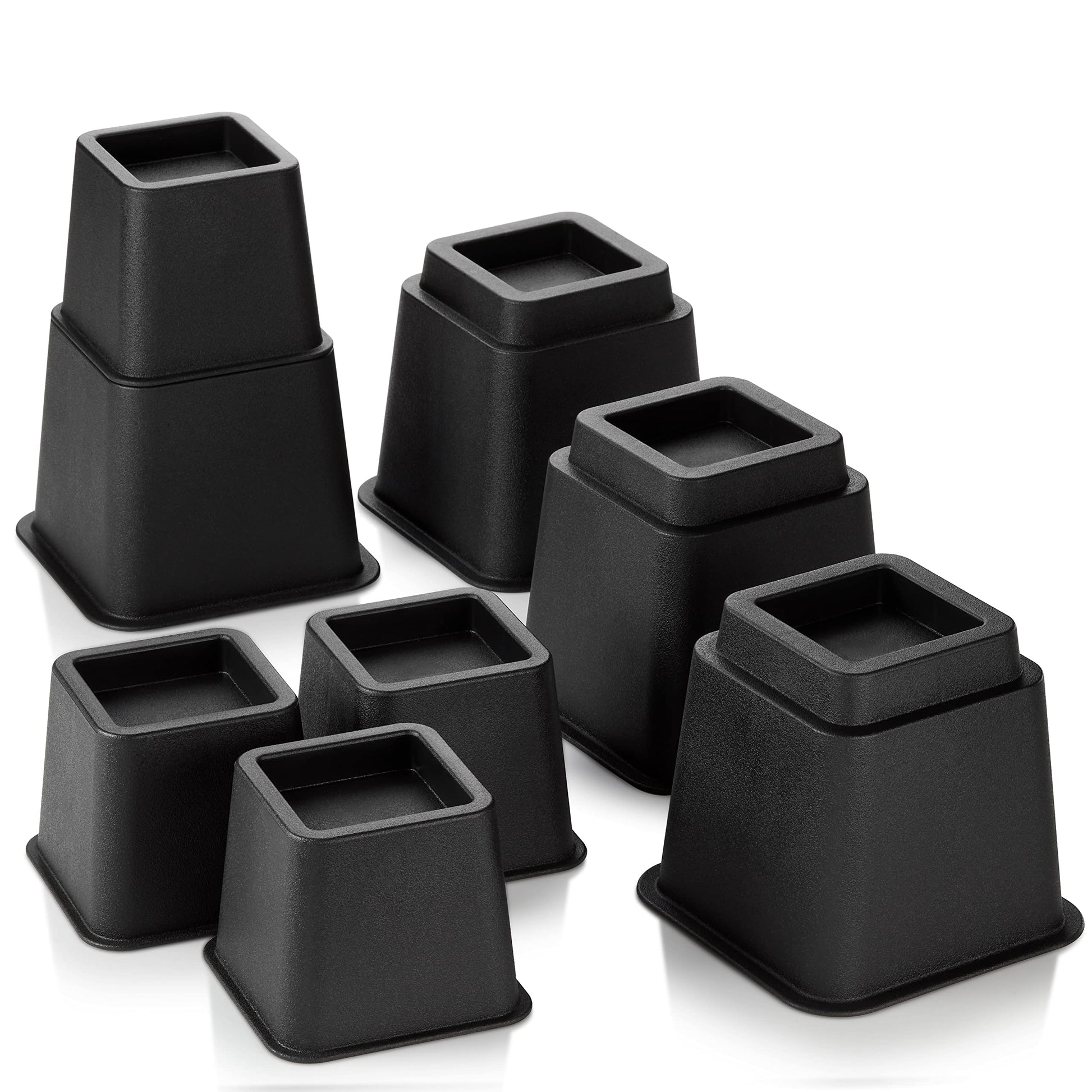 - SET OF 4 BED RISER: The set of 4 bed riser blocks includes 4 pieces of 3" high risers and 4 pieces of 5" high risers. These risers can be used individually to raise your bed 3 inches or 5", as well as stacked to raise a total of 8 inches.